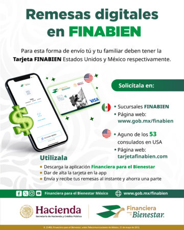 Con FINABIEN, puedes enviar tu remesa de forma digital a través de la Tarjeta FINABIEN, o en efectivo utilizando servicios de remesadoras y enviarla a una de las 1,700 sucursales FINABIEN en todo México.